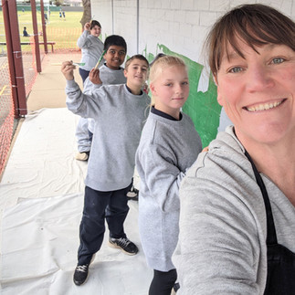 I was lucky enough to be offered a place in this fabulous program working alongside Kyabram P-12 with the Primary School students. The school had a large wall picked out with the intention of a mural. The opportunity was offered as a recess and lunchtime activity, with children flowing in and out as they pleased.