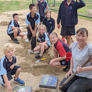After chatting and wandering with the students, it was decided that a quiet, reflective space in the school grounds would be a welcomed addition. There was a well loved spot by the “broccoli tree” that was earmarked and we got to brain storming what this place might include. The plan was to create an environment surrounded by native plants that would attract the local birds and provide a sheltered and welcoming spot. It would have a table to sit at, with upturned logs for seats. A path to follow made up of mosaic stepping stones, with each students creating their own, as a legacy of their time at the school. So off we went……..designing, drawing, smashing tiles, creating and grouting. It didn’t end there, the students got in and also constructed the garden from edging to gravel and mulch, planting, setting in the stepping stones and even concreting in the table. The best bit was the unveiling, with students cutting the ribbon and sharing their very special place with family and friends.